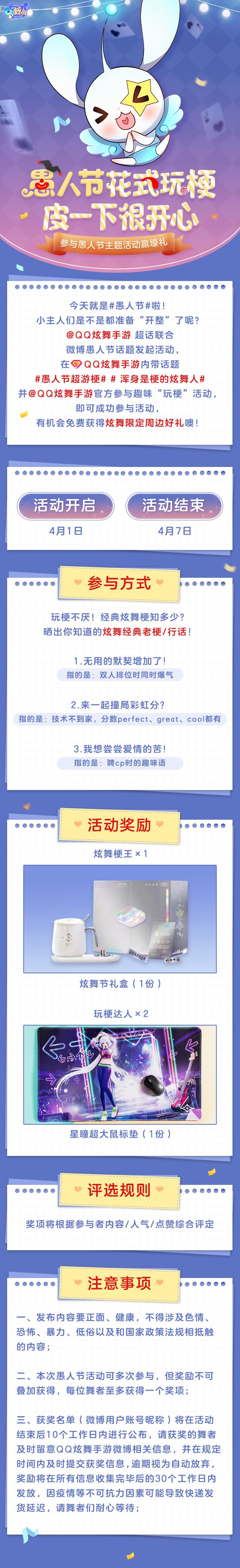 进入官方微博愚人节主题活动页面,前往参与活动发布“趣味游戏梗”赢取炫舞限定周边——【炫舞节礼盒】&【星瞳超大鼠标垫】奖励!