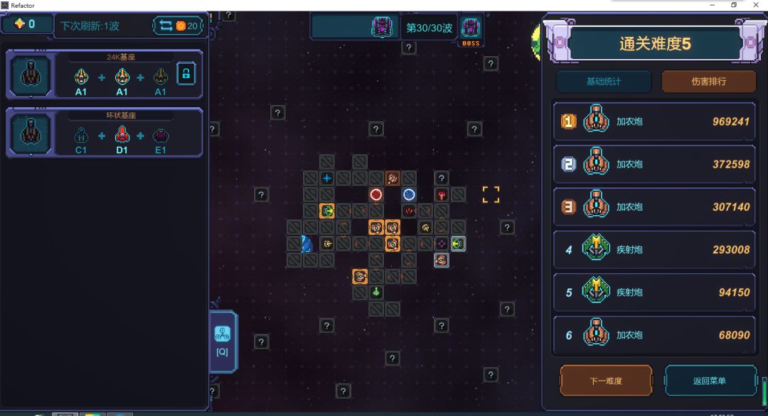 然后接下来的几回合就稍微扩展一下道路(全长大概有八九格就够用了),同时快速重构出第一个重构塔(建议选加农炮,比较稳)。