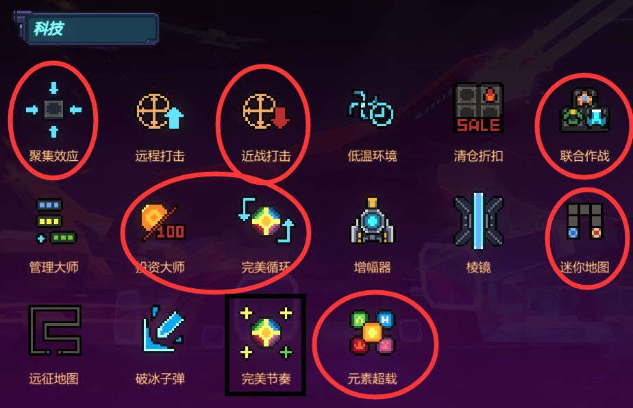 科技方面,因为难度5只有30波,可以说只有前期,所以选的时候往短期收益高的选就行了。下图有红圈的是我觉得比较好用的,而那个画了黑色框框的请避坑!那个是无尽用的,不适合难度5。