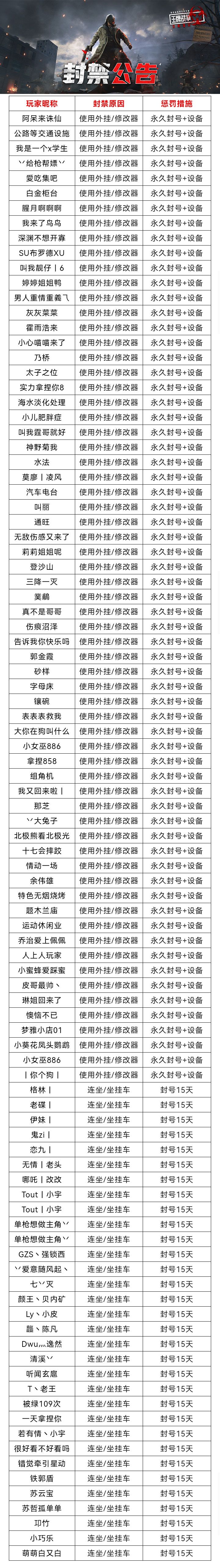 《王牌战争:文明重启》官方一直致力于维护游戏公平性和保证良好的绿色的游戏体验。针对使用外挂、连点器、第三方软件等行为,研发团队已经在第一时间优化了监控系统,确保作弊行为在被发现后及时锁定相关账号。在锁定作弊玩家后,我们将会给予对应的惩罚。如发现此类作弊、违规的玩家,我们会对其进行封号、封设备等措施。文妹想让更多的玩家感到安心,为此我们决定每周五公布外挂封号名单。让我们的净化行动“透明化”。文妹也希望各位能坚持正确的游戏态度,与我们共同守护游戏环境,抵制所有外挂、作弊、第三方软件。也欢迎使用举报系统、专区留言等方式向我们反馈。净化游戏环境,我们一直在努力!本周共处罚账号6321个,其中封禁开挂账号2891个,坐挂车/连坐账号32个。以下是3月26日-4月1日部分严重违规玩家名单,玩家均已受到惩罚。