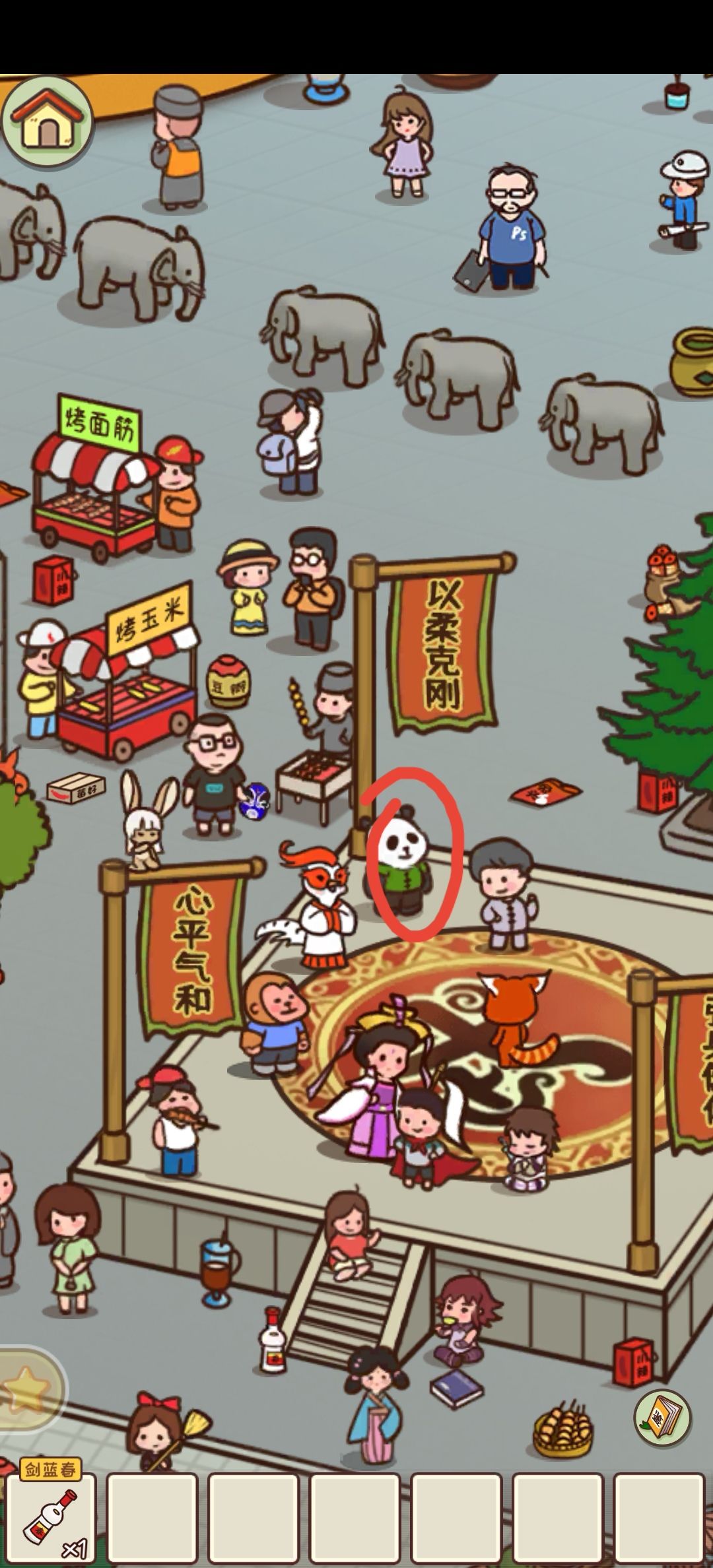 如下图,点击熊猫触发,按照他们对话的指示按顺序点动物,要看清小熊猫是擂台中间的红色小熊猫,兔子在心平气和那面旗子上