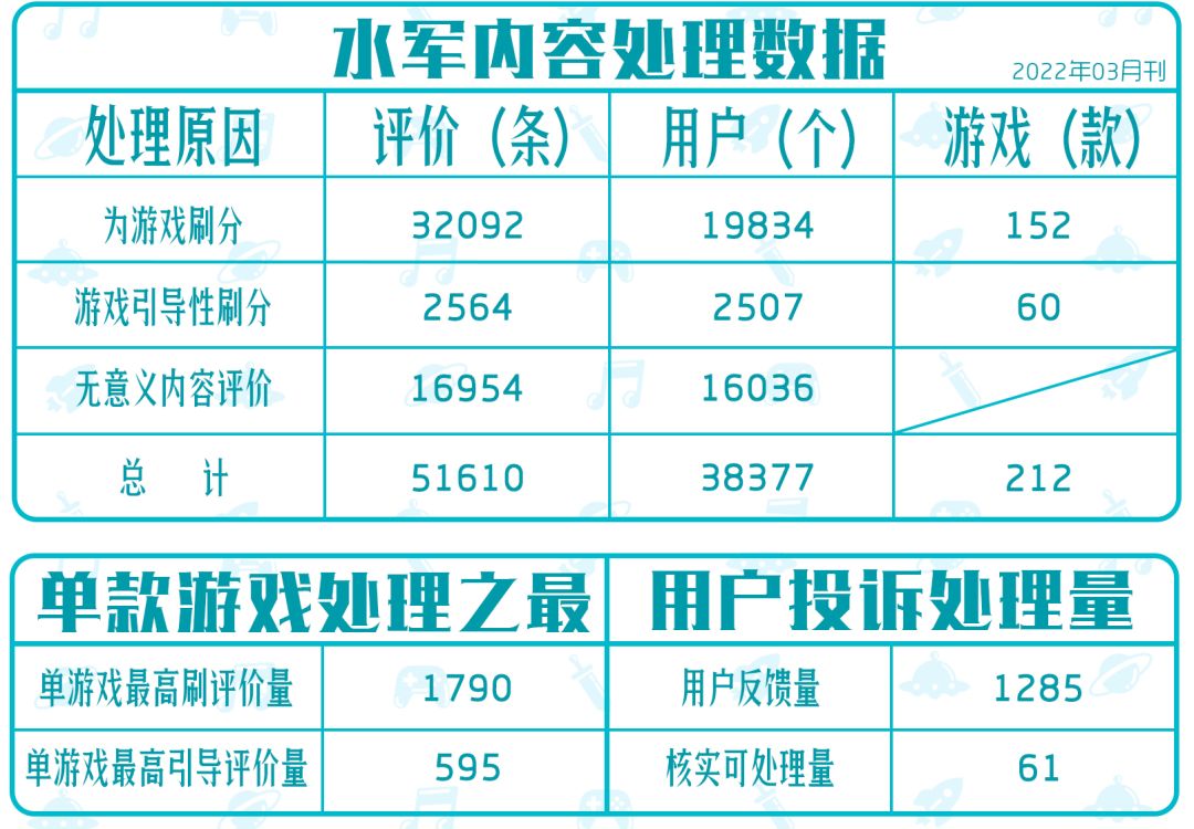 本月水军评价共处理51610条,处理了有刷分行为的游戏共212款。收到用户总反馈量为1285条,核实后可以处理的数量为61。