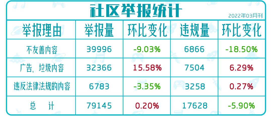 本月总收到79145条举报,平均每天处理2553条,环比上月上升0.20%,其中广告、垃圾内容的投诉比上月增长较多。在TapTap社区管理团队的复核下,处理违规内容共17628条。