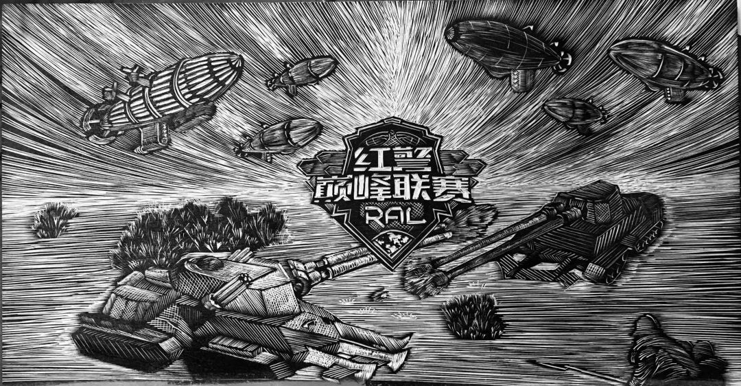 例如某位硬核红警玩家,就用自己创作的红警OL巅峰联赛应援版画作品,记下对这部不朽经典刻印。在版画上,红警标志性单位基洛夫飞艇、天启坦克在版面上栩栩如生,好似那激烈的战场就在眼前。
