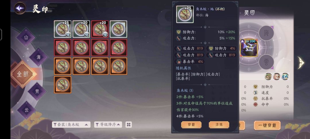 或者〈角木蛟〉🔽→对生命值高于70%的单位,伤害提升30%。各位就直接理解为:战斗刚开局,装备了这套灵印的灵妖,攻击不止多30%。