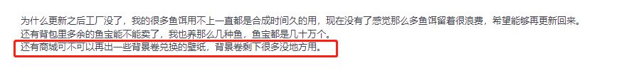 反馈:鱼池仓库容量太少了,部分需要强化的鱼或者得到活动鱼只能放生空出仓位;