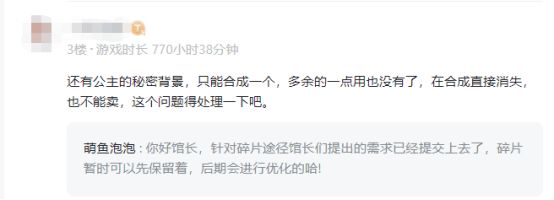 反馈:公主的秘密碎片只能合成一个,多余的碎片留着没有用;