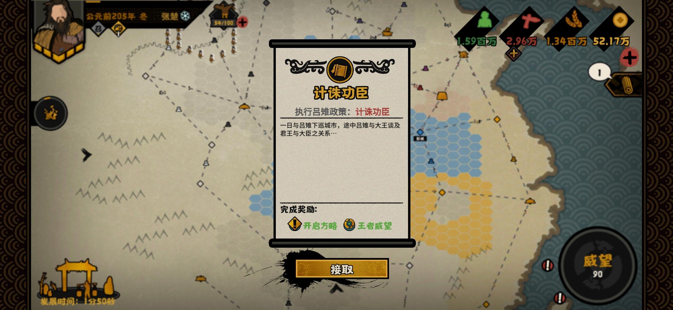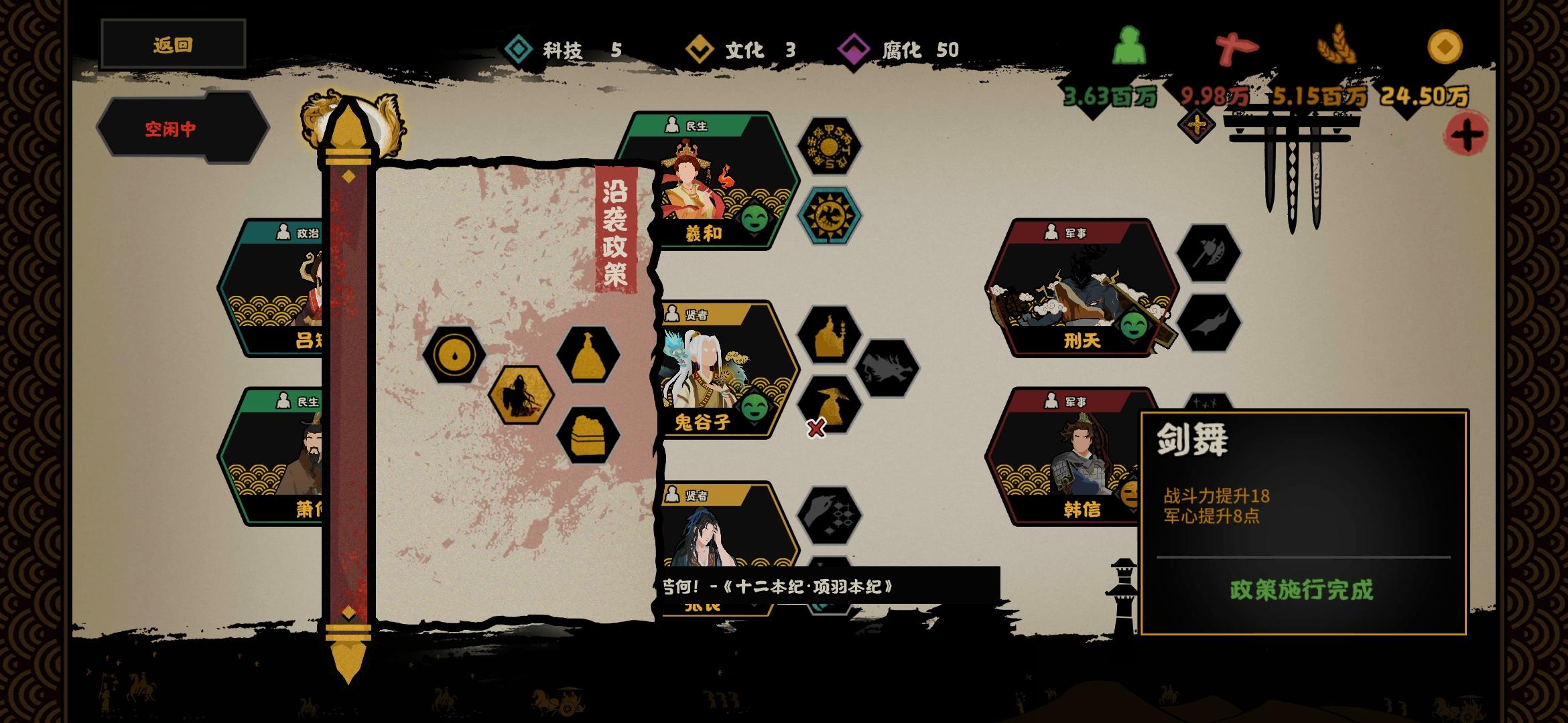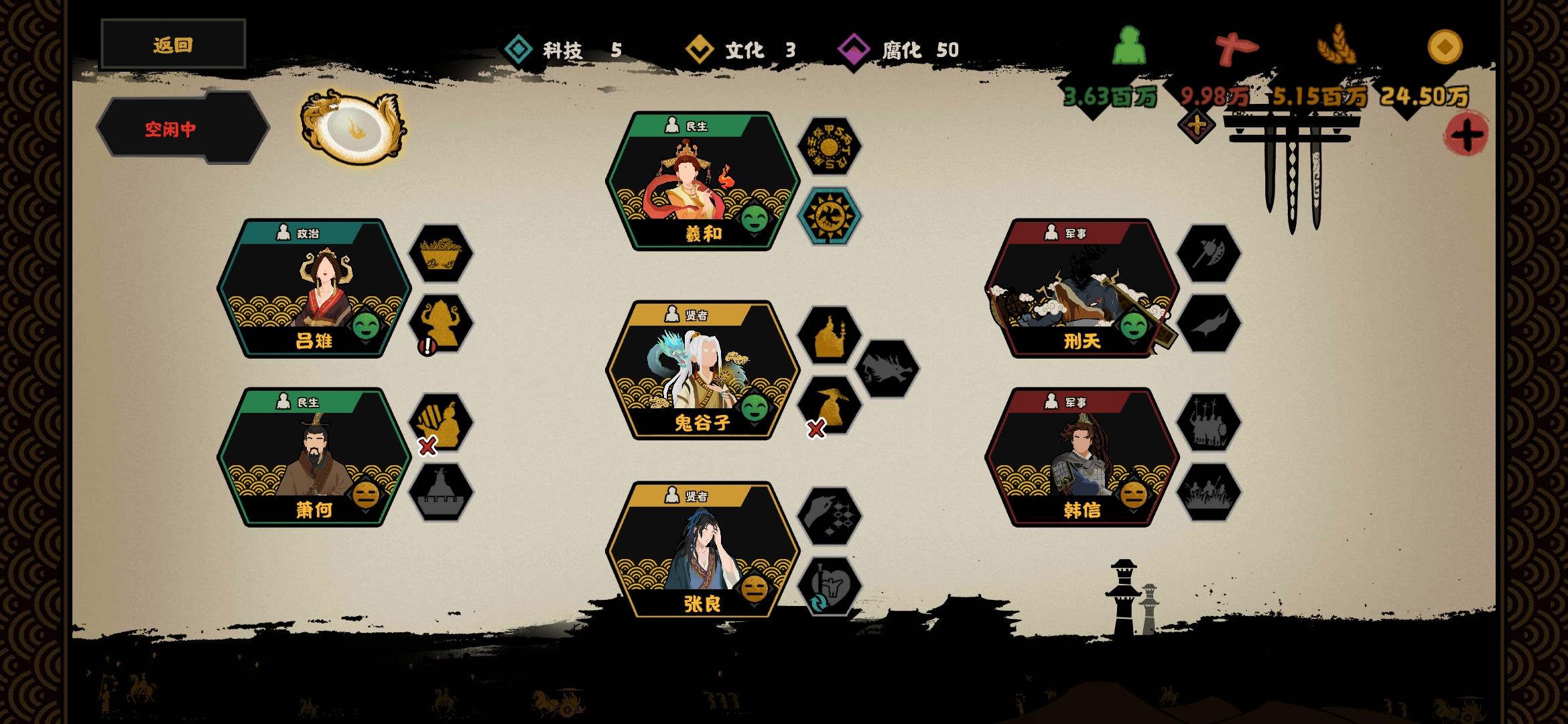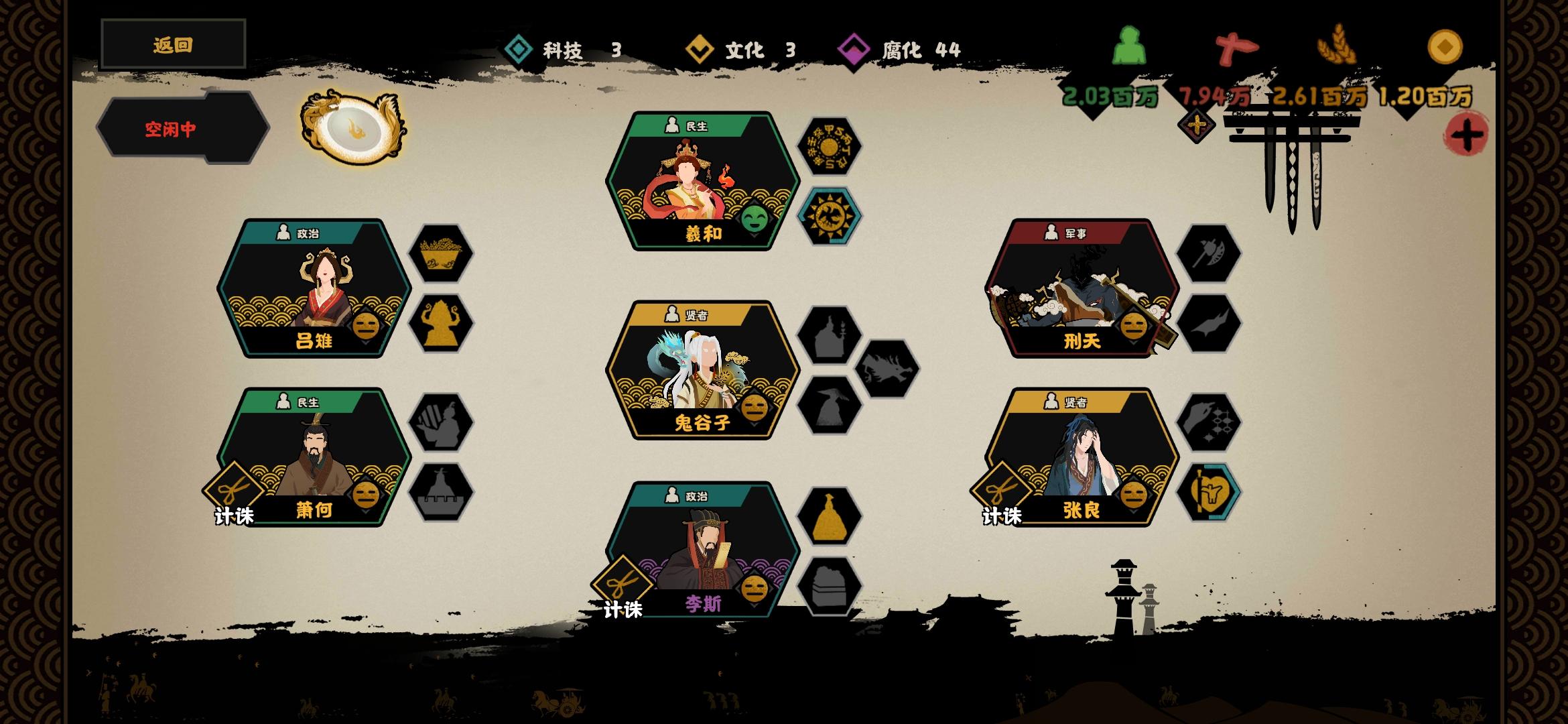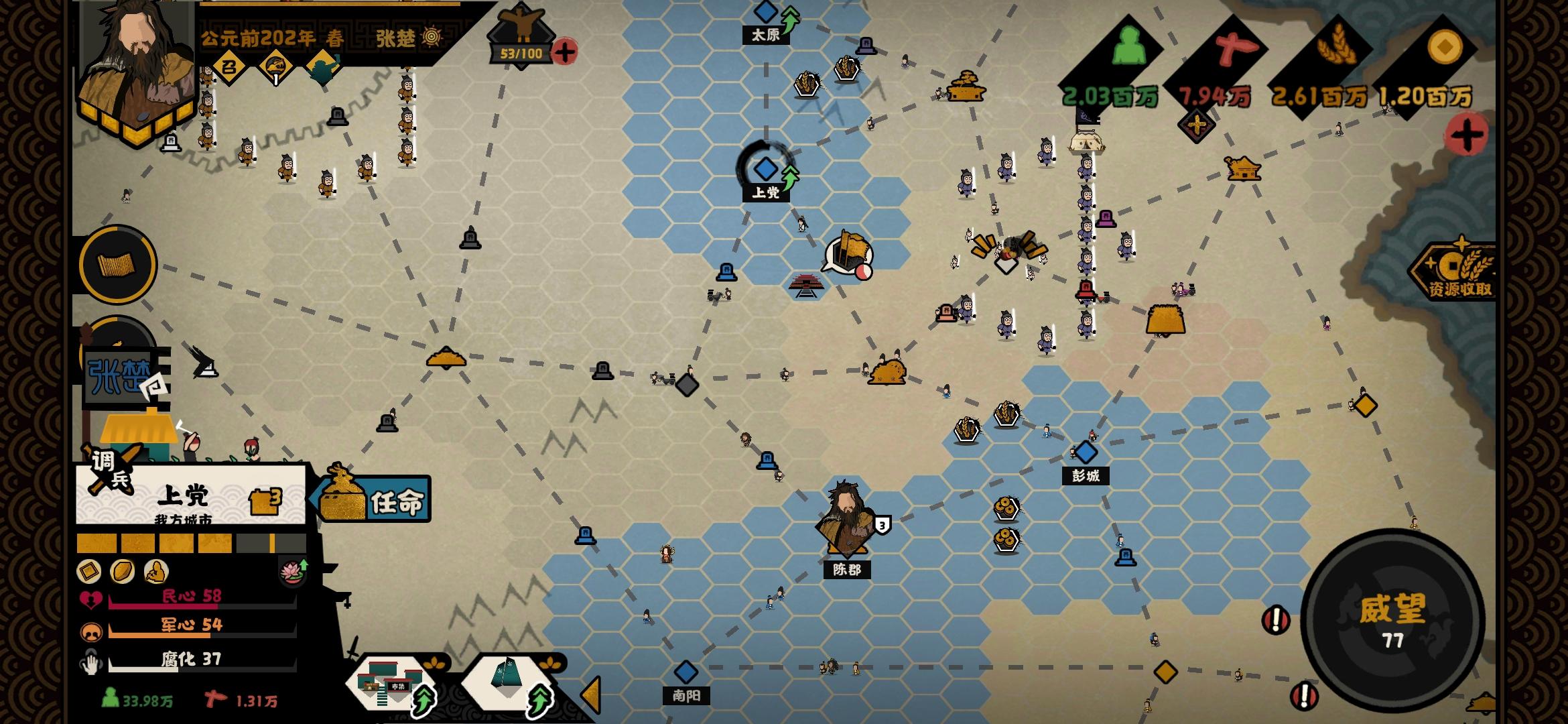 我自带了吕后,收了虞姬和李斯的技能全程不需要攻打相应的城市,咱这个位置就是人才中心(下水沟)都流过来了反正。