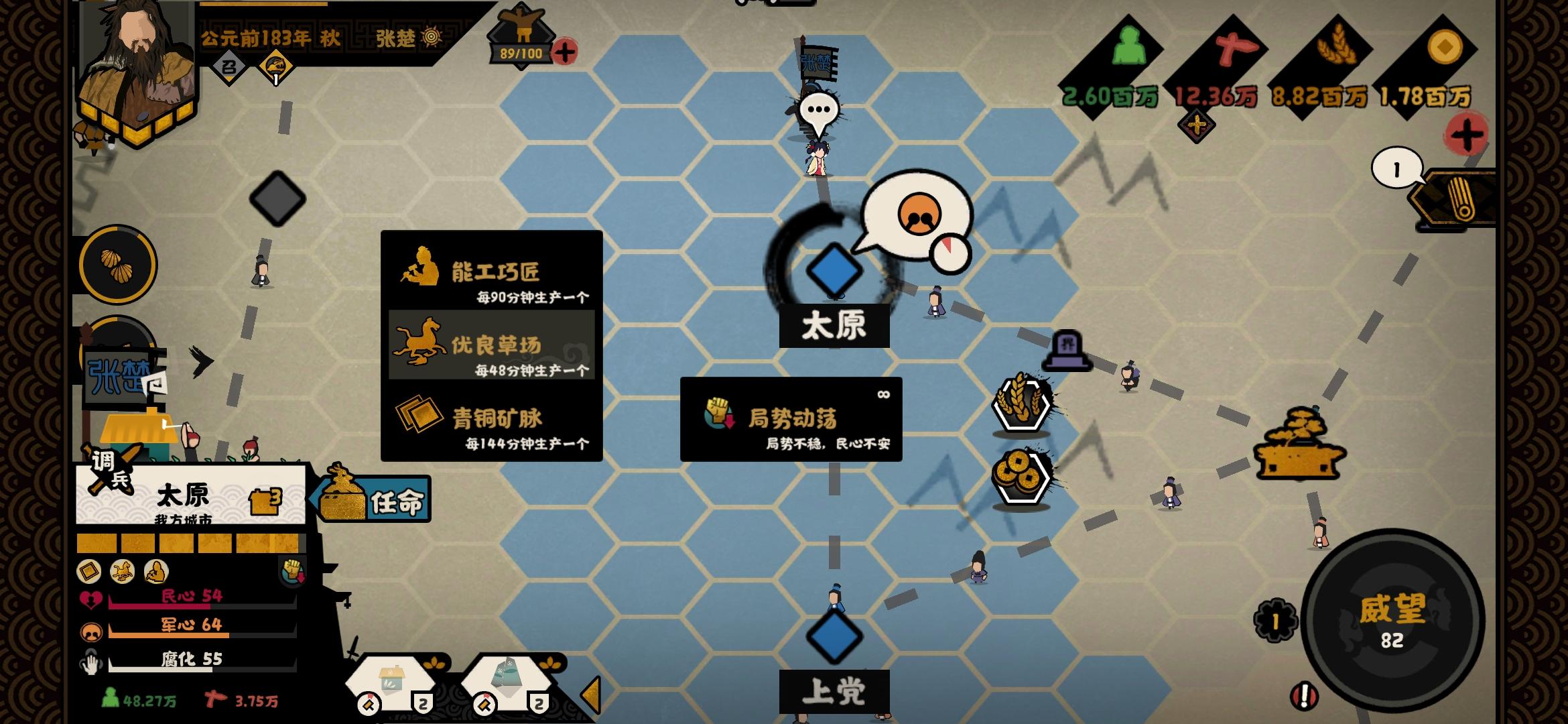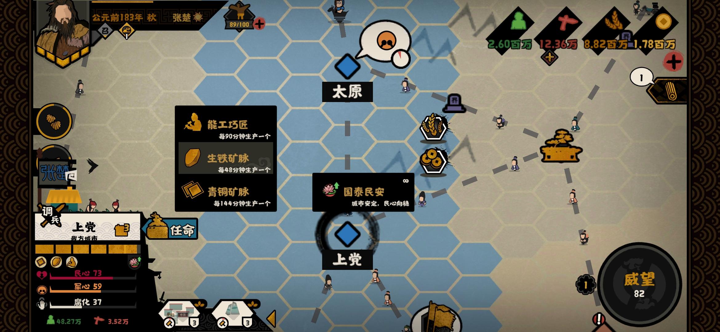 上党二城产马匹和铜块。自家出士子,稀有资源一把抓,还有李斯送科技,爆兵我也快人一步。
