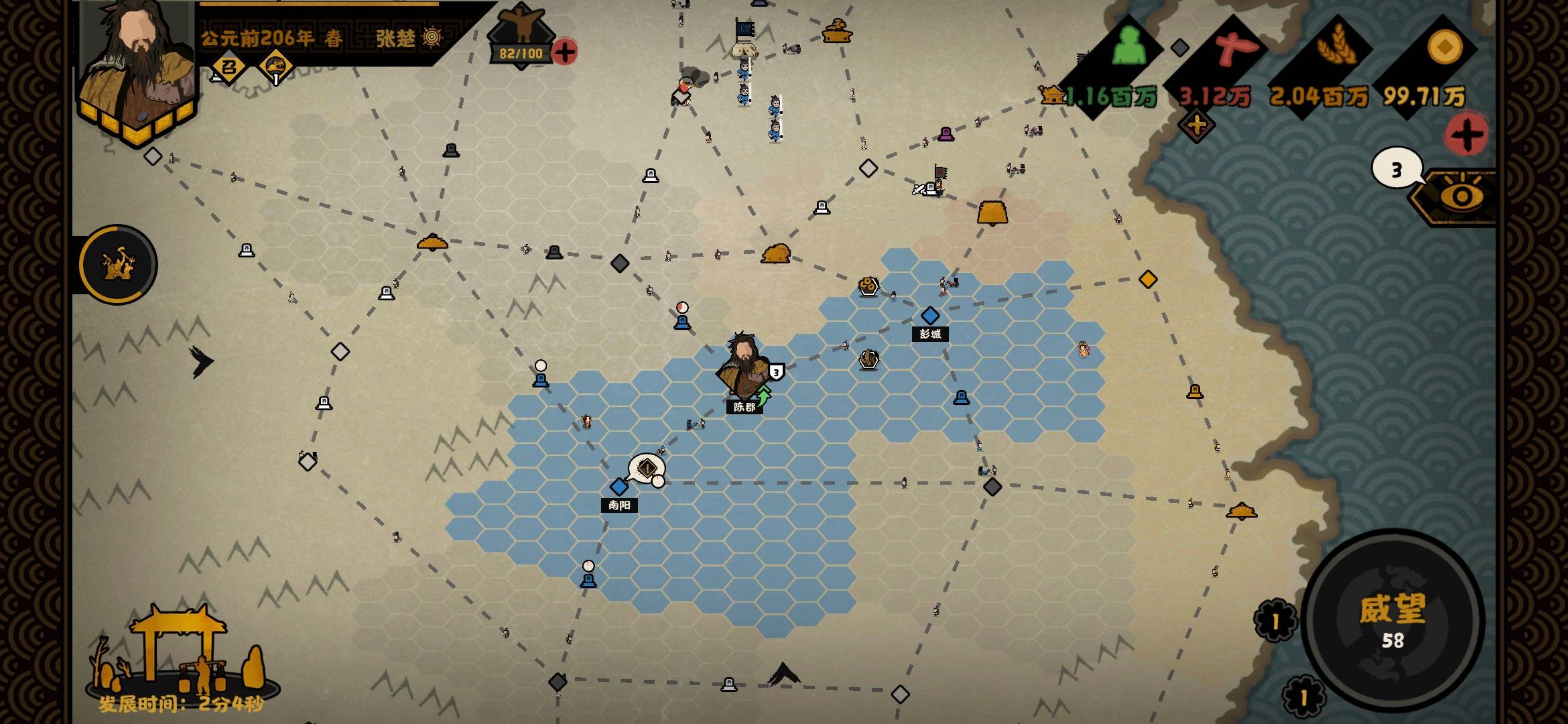 因为我们很早就会满威望开会盟,用点阴谋直接要呗,首先还是和楚国结盟,他打哪里你跟着打,把他限制到2块地,然后开个献城他只能给东海了(只拉楚和他的好兄弟汉,我相信老流氓会让我一次成功)或者潜谋(需要威望和鬼谷子,但是张楚的诏令就是白加20威望所以也不是很缺)