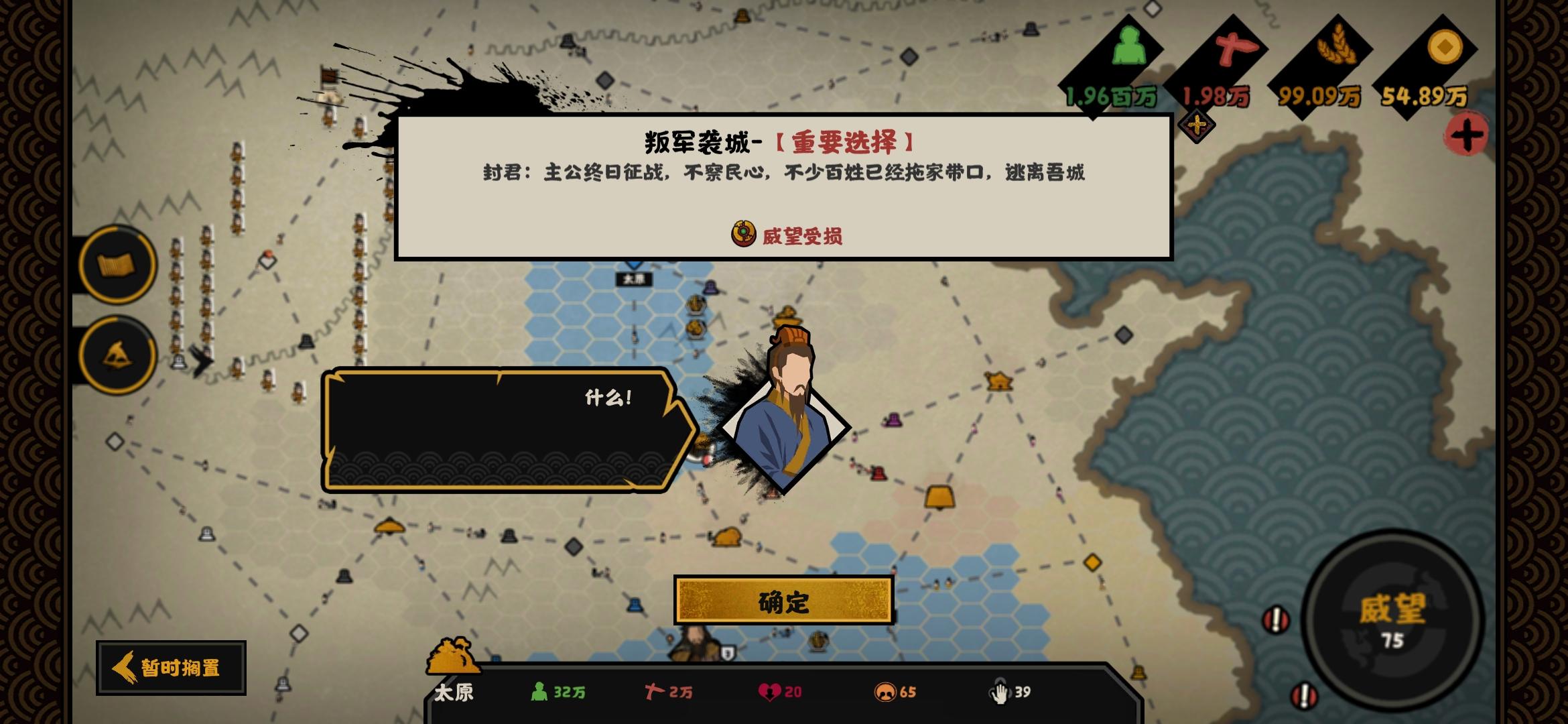 (关于威望有两点,第一点就是经常出劫掠秦国粮车货车事件,不截+威望,截了+钱粮,分给百姓还能+民心。第二点就是专属诏令无伤+20威望,于是不用带加威望角色也可以愉快开会盟不断,这属于天生的威望流了)