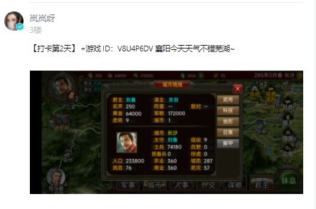 本帖下方评论区回复:【打卡第2天】 +游戏 ID:V8U4P6DV 游戏中占领的襄阳截图