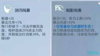 天赋设置上,推荐玩家点出双刀的三天赋。虽然乘胜追击和暗影突袭都是不适合双刀在副本持续输出的PVP天赋,但是起码背后的属性加成不错,所以点出这两个天赋聊胜于无,毕竟没有更好的伤害型天赋选择。