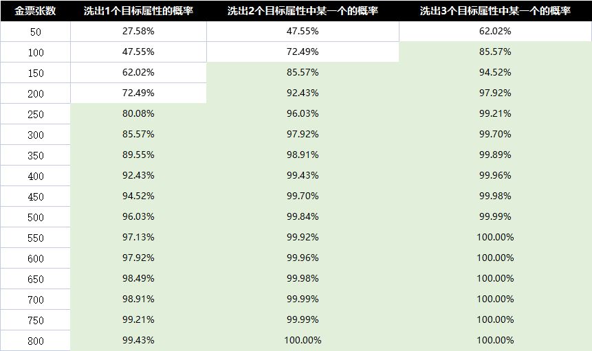 那么这样不到100张票就大概率能洗出以上3属性之一。如果是2个属性其中之一,大概150张金票也就出了。