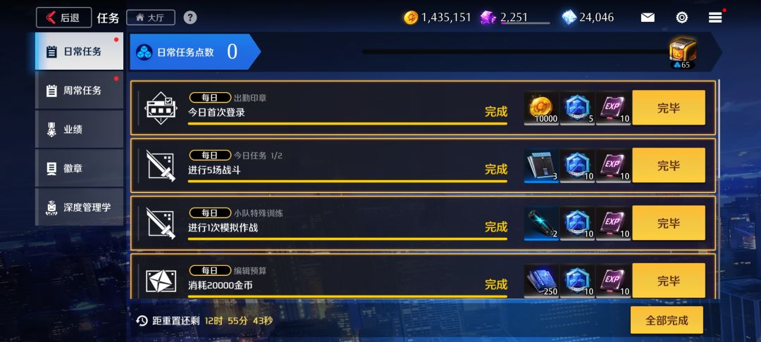 现在你就可以点击左下角的任务界面,领取每日任务。连着领两次,因为你已经做完了所有的每日任务。
