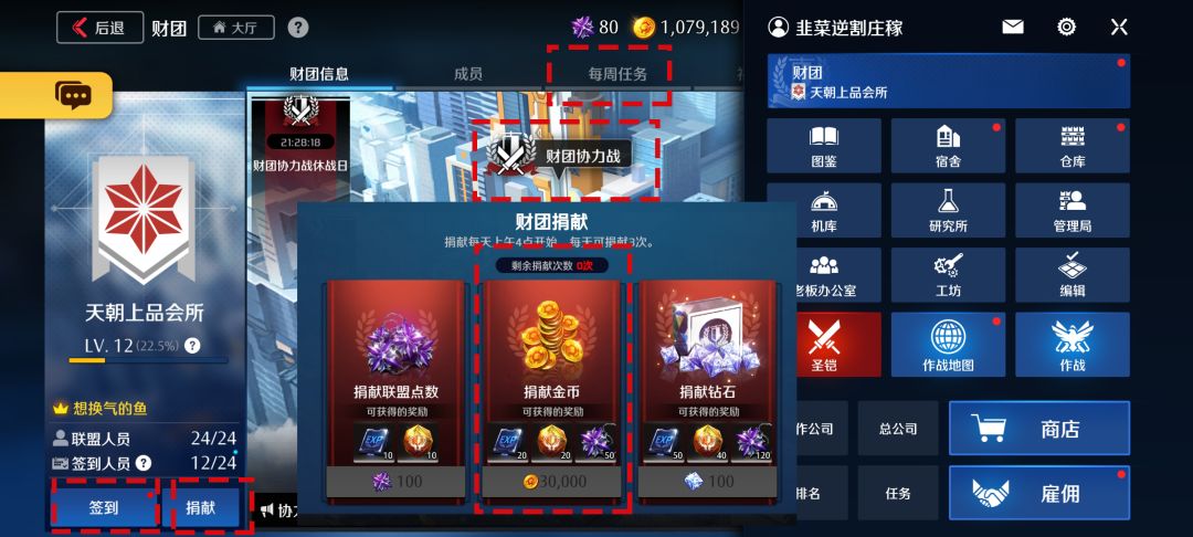 第三是看一下财团协力战,一般是先打小据点,最后一天打boss,别错过时间。萌新打满次数就行了,不用在意伤害。