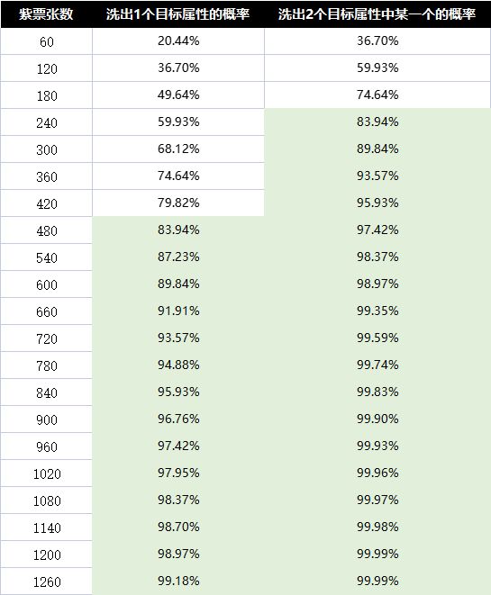 金票出某个属性的概率是1/16,紫票出某个属性的概率是1/18,由此计算得出洗不同次数出想要属性的概率如上。