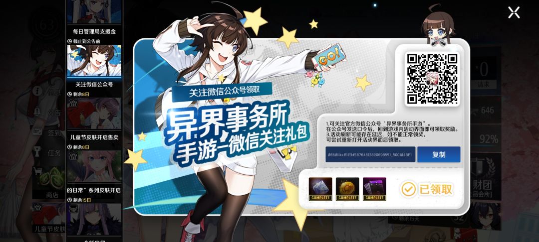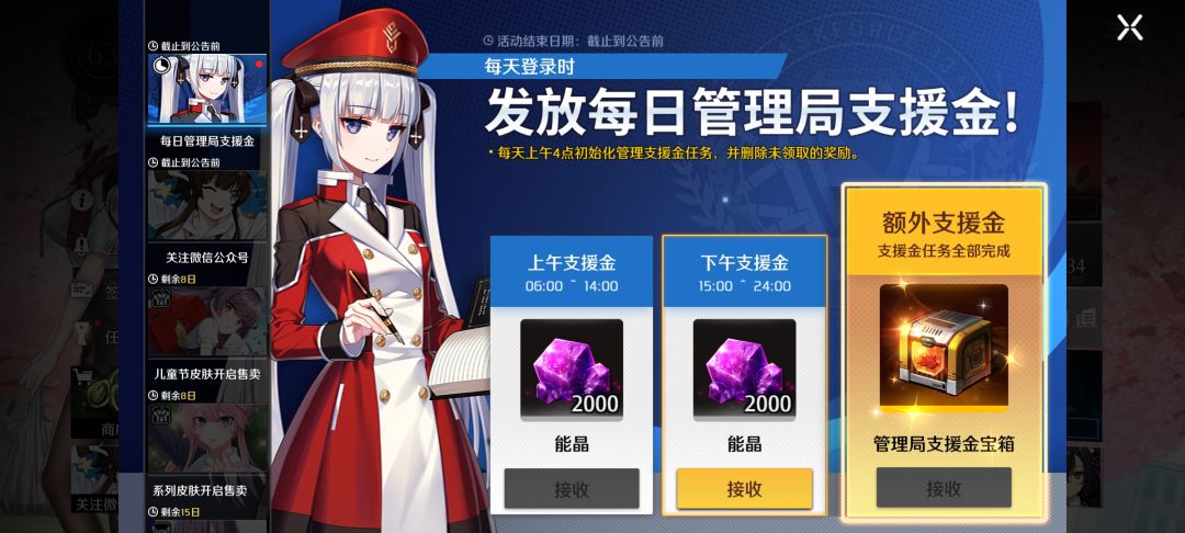 每天上线记得在左下角的海报里领取体力,14点前和15点后可以各领取一次,两次都领取了才能获得额外支援金,里面是金币和信息,所以尽量上午下午的都领了。