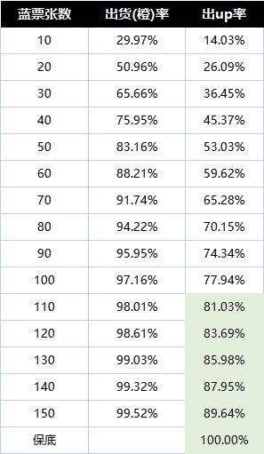 因为保底不继承,强行赌脸只会错失一个保底又不出货。如果非要赌脸至少也要有110抽再下手,这样有80%概率抽到当期up,就算没抽到,剩余14天也很容易凑齐40张蓝票吃到保底。