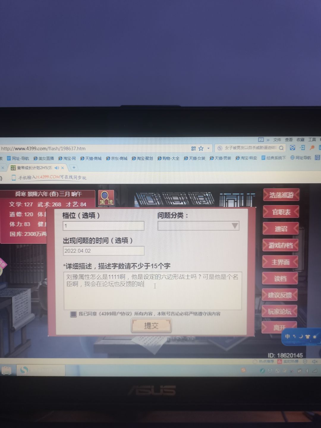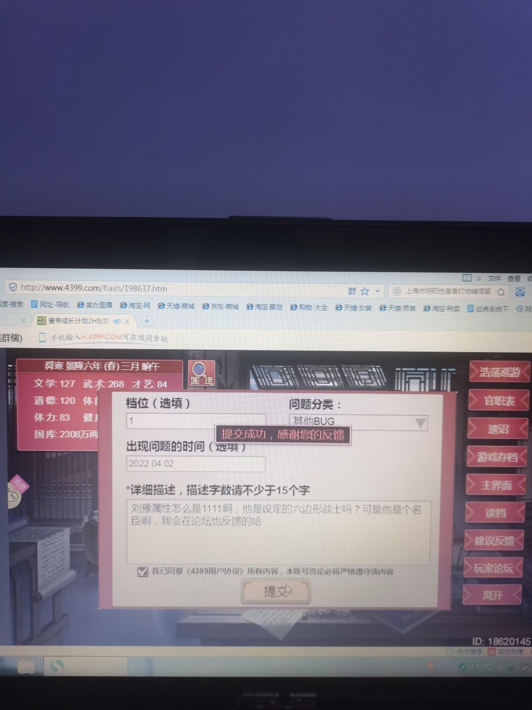 我不知道怎么找论坛官方啦,但是希望有人帮我找一下,我这里出bug了,虽然我不知道这个刘豫,但是作为名臣,也作为一个看起来好像有点拉的皇帝,起码不会是111111的六边形战术叭
