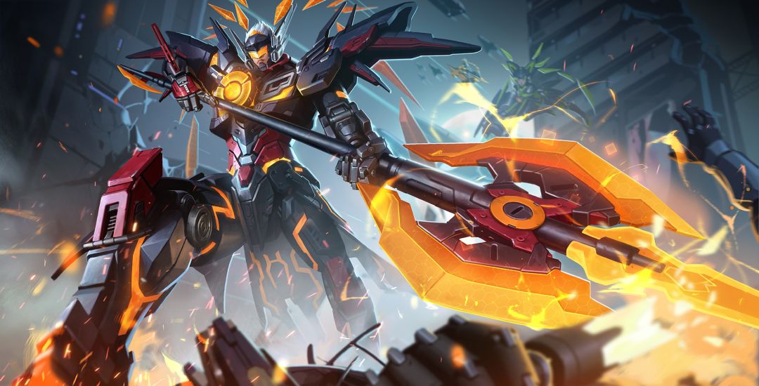 延续了末日机甲的主题包装,在此基础上增加了更多的细节设计,提升了材质的丰富度,突出机甲的科技感,同时优化了身材比例,使得吕布更加高大威猛。我们还对局外展示动画中吕布变身的战机做了新的设计,造型上采用了大量三角元素使其更具战斗感和攻击性,尾部增加了尾翼和喷射装置。