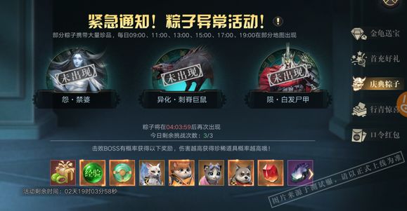 活动期间,每日的9:00、11:00、13:00、15:00、17:00、19:00,将会在尸洞、镖子岭、石道迷宫、后山中的随机3个地点将出现异常活动的粽子。异常活动的粽子在出现后的30分钟离开。玩家每日有3次击败活动粽子获得奖励的机会。