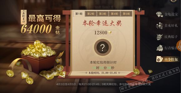 每天晚上五轮天降红包,参与就有可能获得12800金钻大奖,每日最高可获64000金钻!