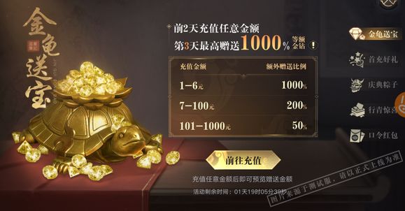 活动期间充值任意金额,结束后最高赠送1000%等额金钻!所有直接付费内容均可参与累计,各充值区间额外赠送的金钻叠加。