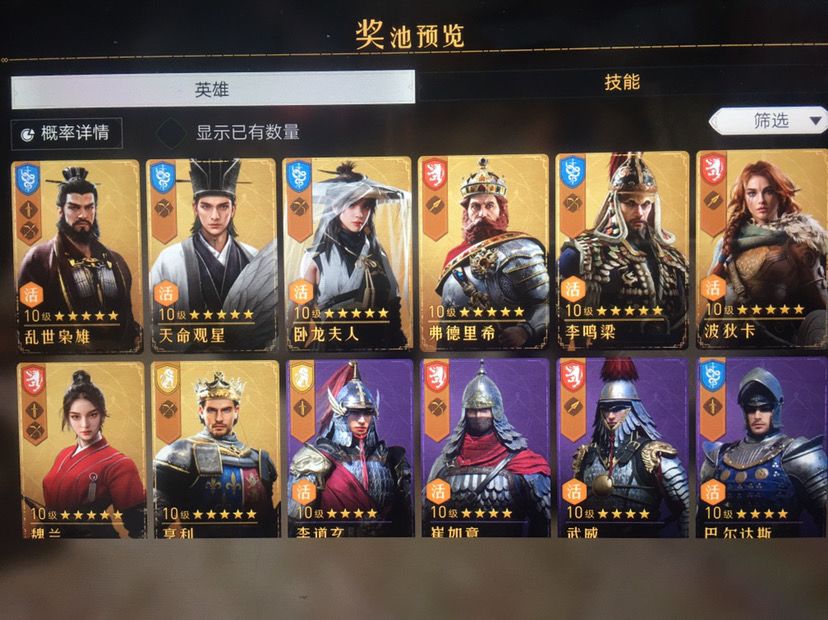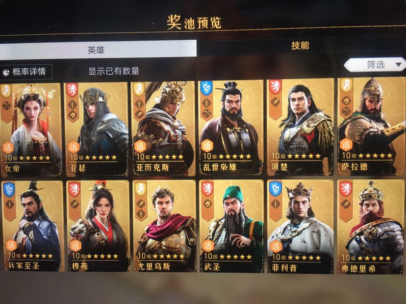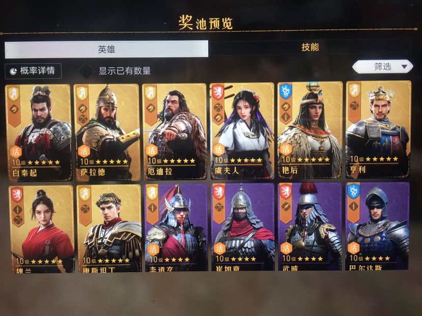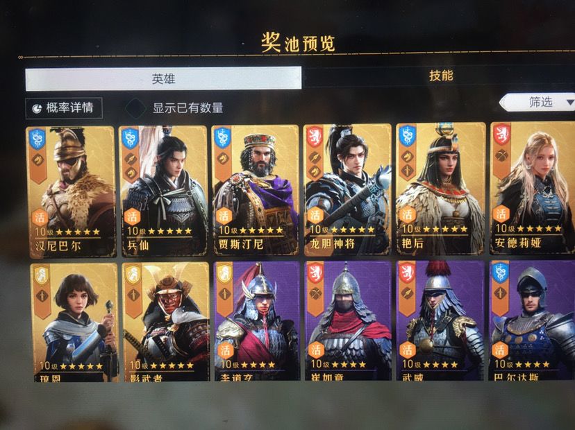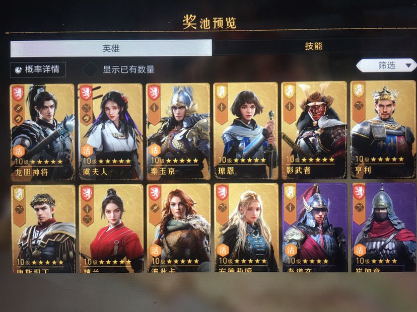 基本上都是亨利、魏兰(花木兰)、影武者、波狄卡、琼恩。价值一千多RMB的游戏币砸进去只能出一些边角料英雄能重复人手两点了三个,但是像曹操、诸葛、女帝(武则天)等这些在卡池的英雄连影子都看不到!还砸钱?多了不说,再砸一万也许也就冒个泡泡。这不是玩游戏,是玩命噢