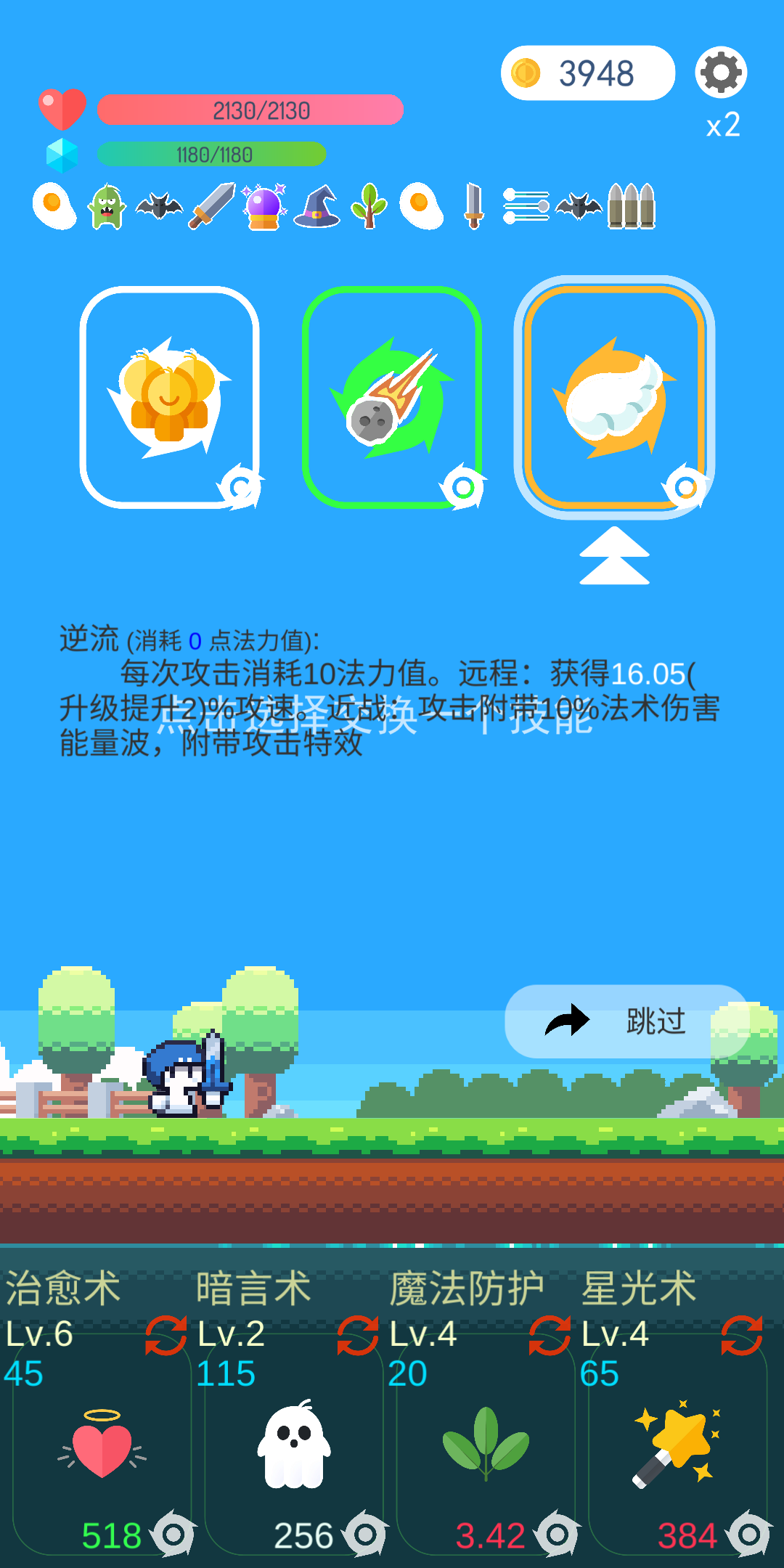 第一个有治疗必拿治疗,因为休整阶段只要不是持续性技能,其余都是无cd,我们可以利用这个惯性达到每回合血条满状态,后面依次火球-原力-毒药 这四个技能非常容易过度不要求等级,但释放的时候注意顺序,怪一上来先别急,等所有怪都到跟前了直接就是一个毒一个火球一个原力弹开闲暇之余奶一口,一波就结束了, 这样前期就能安稳度过了,