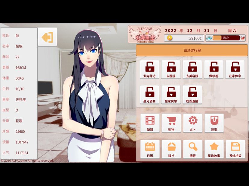 我选的是简单模式。开局会有10w。我会先拿去买衣服。因为你的活动成功的程度是看你的穿搭(加成非常大)!所以建议开局先去看新闻,先把当月需要的衣服先买掉。然后一直买买买给自己留5000-1w就够了。之后就去搞创作!