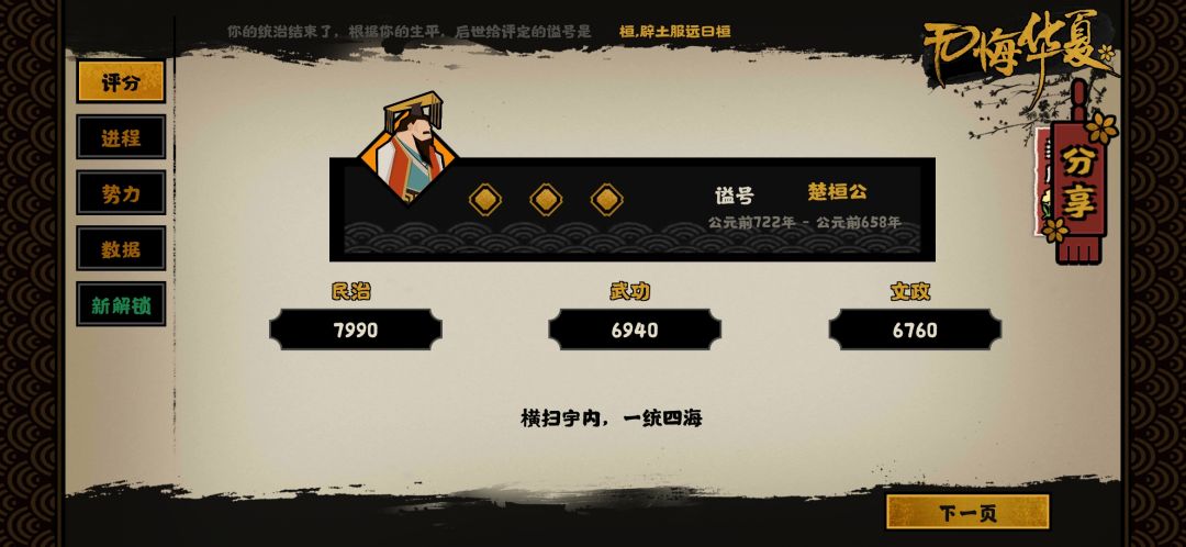 (2)然后给降到80-89后举行一次会盟,让威望从100变到80以下。可以触发孔子技能(威望每次达到80,腐化-10)(这里是游戏bug,技能写的10,实际降20)