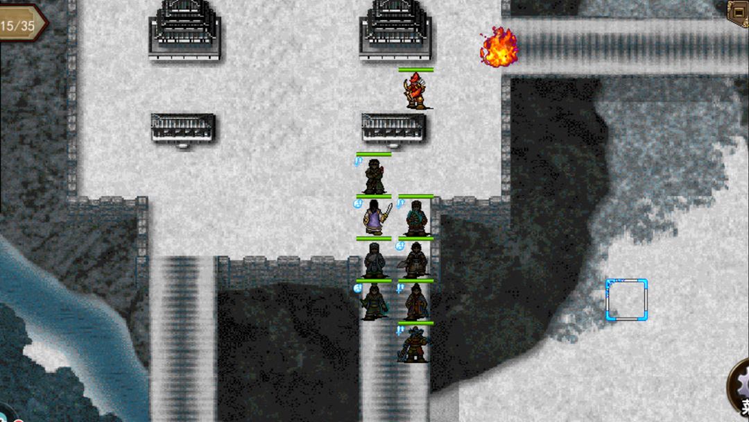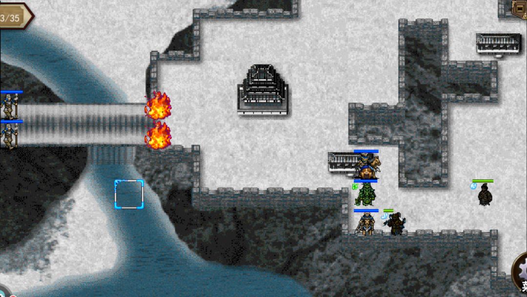 打完于禁后,下面的张郃会上来,这时候你要往上撤,因为等级低输出慢的话可能会回合吃紧,一遍撤一边恢复血量,蓝量和加上buff。上图的典韦下面是我刚秒掉的张郃的位置,注意张郃也是远程攻击范围的。