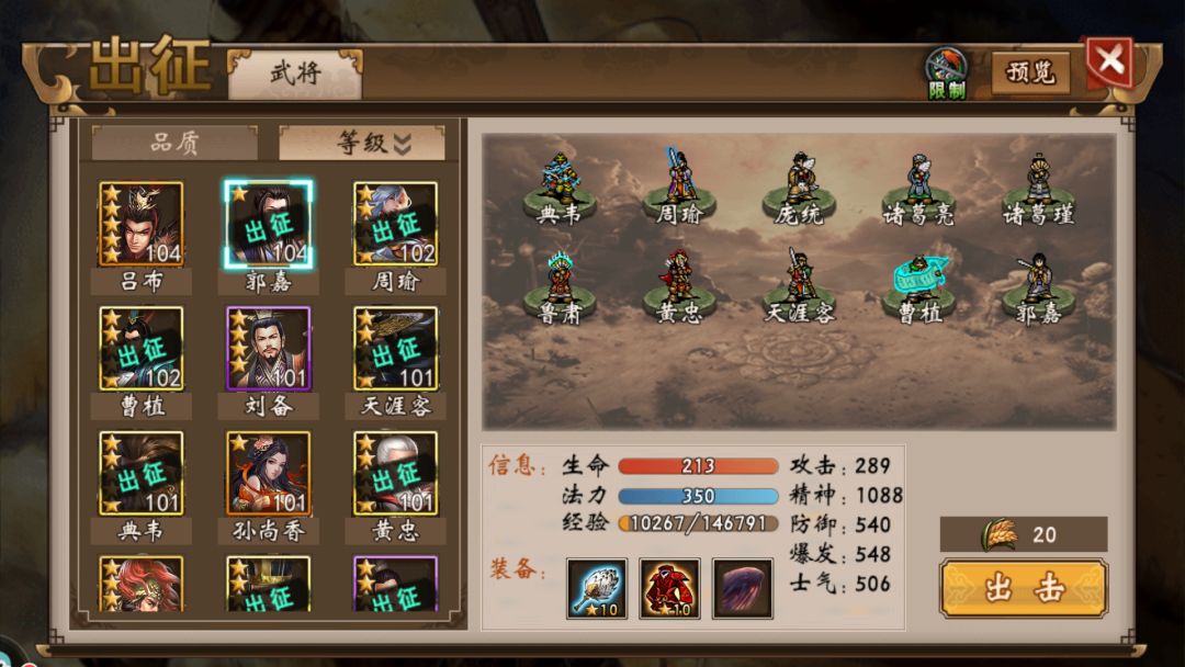 上图是我的出场武将,等级不高的话也可以带练步师穿没雨箭或龙骑尖在典韦后面远程打一下,失血加诸葛瑾的毒还是很猛的。而且这两个武将被动都有buff加成。