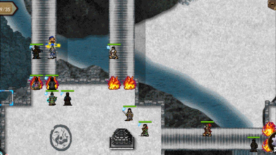 跑的快的可以在这堵,跑得慢的就在下面的桥上堵。先虚弱加上,然后控住BOSS,诸葛亮先站在周瑜曹植输出地方的旁边,然后再输出。打完前一个BOSS,后面的路才会被开启。第一个是徐晃。
