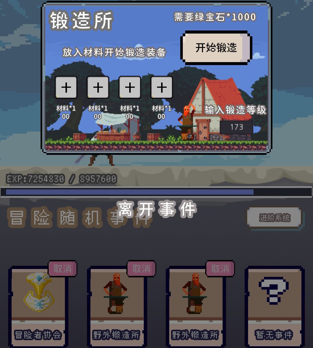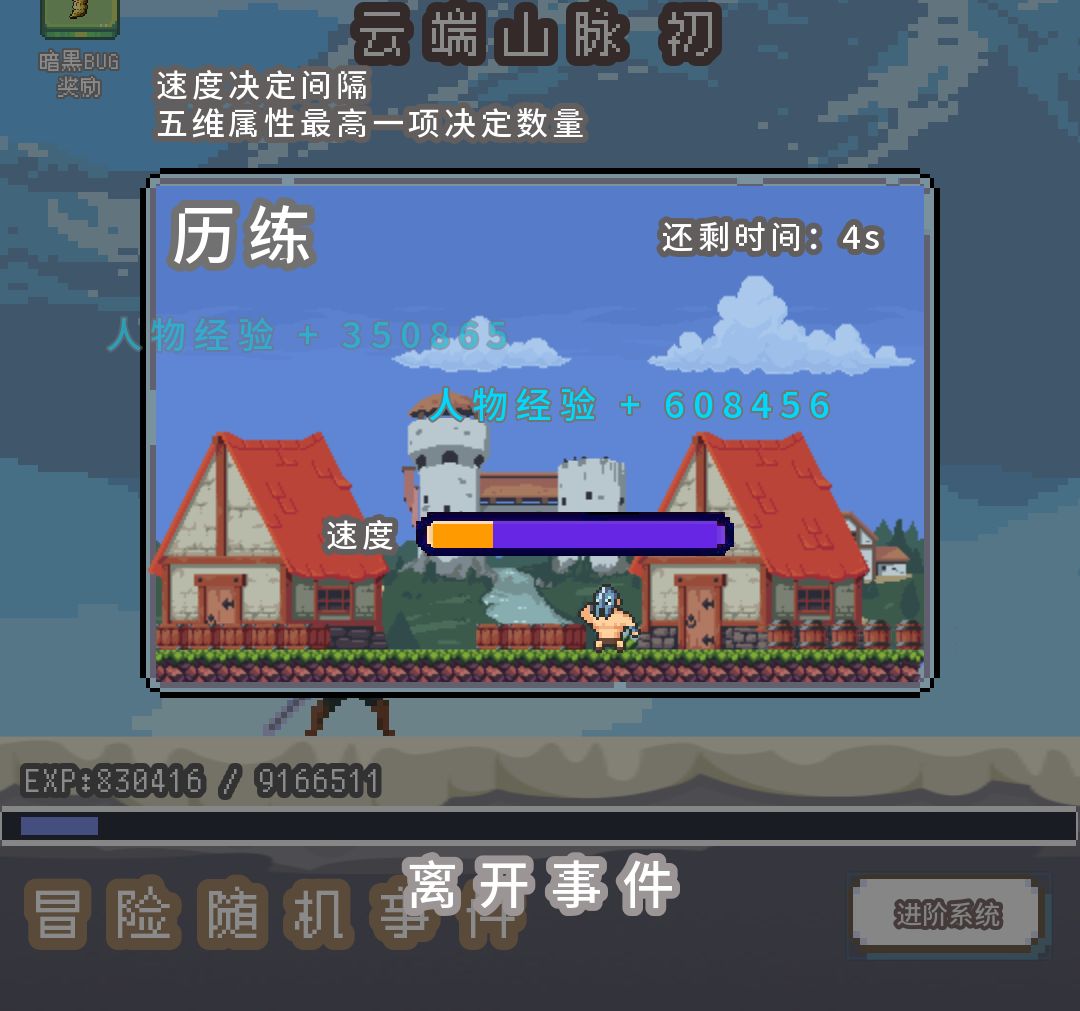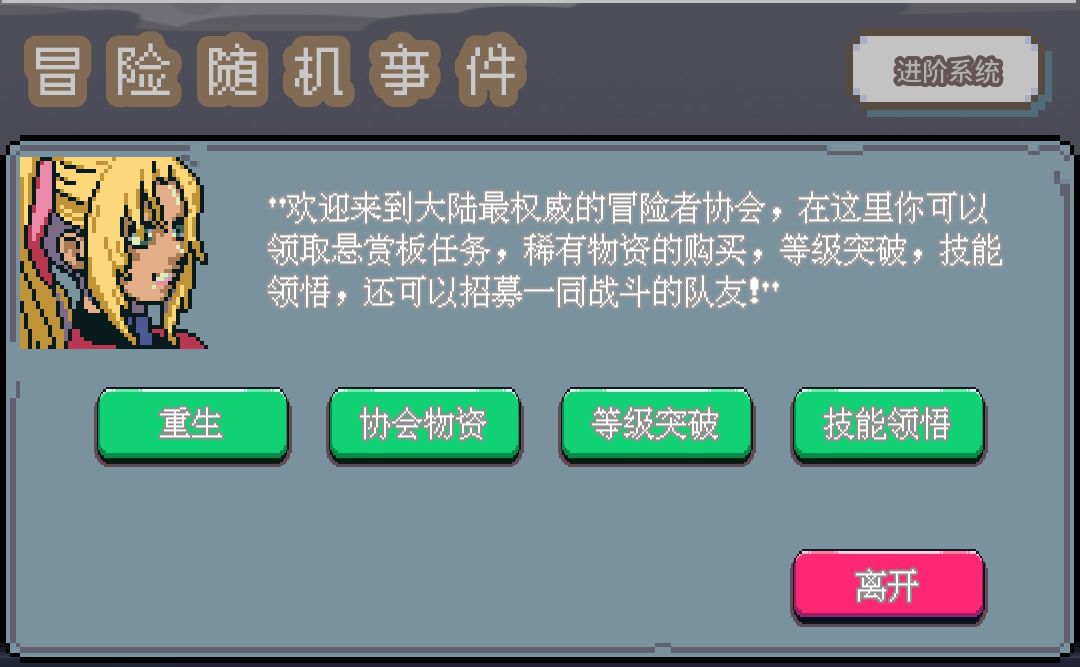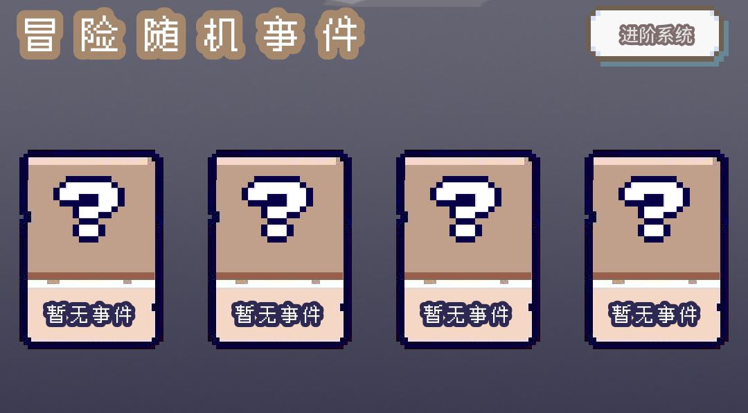 第三块界面,冒险随机事件,随机事件发生概率和幸运的数值有关,所以强调开局全点幸运,点满幸运基本几秒一个事件发生,点击一个事件会消耗相应的体力值,右边有一个进阶系统