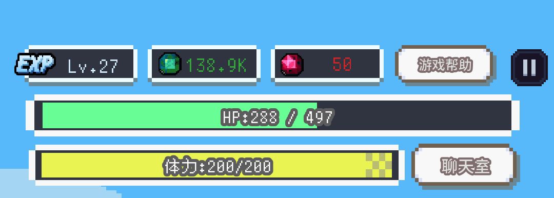 第一块分别显示等级信息,绿宝石数量(一直没啥用,多的用不完),红宝石数量(有点用后期也是多的用不完),游戏帮助界面入口,游戏设置界面入口(可以换CDK),绿色hp血条,黄色体力值(基本用不完),聊天室(有了聊天室这个游戏会让你产生这个游戏不是单机的错觉,非常好用)。