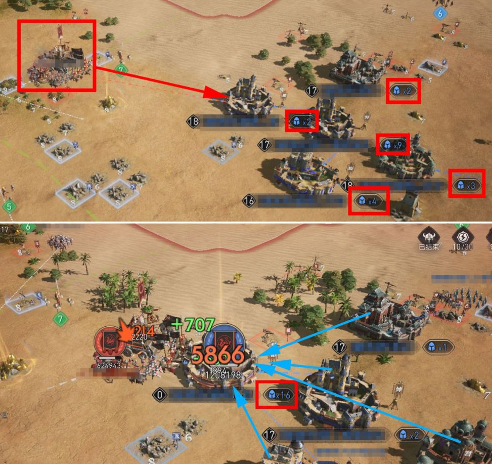 资源田从6级开始就会变成两队守军,首先切入战斗的部队将承受两队守军的满额攻击伤害,后切入战斗的仅承受单队守军的70%溅射伤害,因此领主们可根据自身阵容调整攻击顺序。