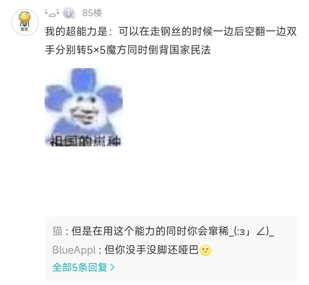 本周我们论坛的互动话题是“说出一个你的超能力吧!但回复你的人可以加上一个限制条件”,看完1000多条回复我已经笑到缺氧了……