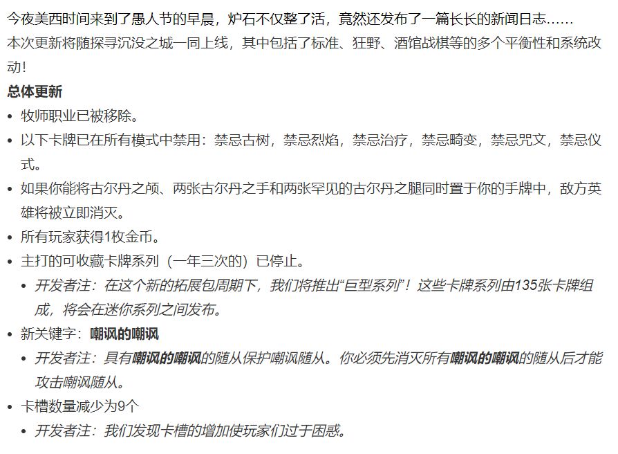 《炉石传说》在愚人节当天发布了一篇超长的(假)更新公告,不过在上百行内容里我一眼就看到了这条“牧师职业已被移除”,正道的光!