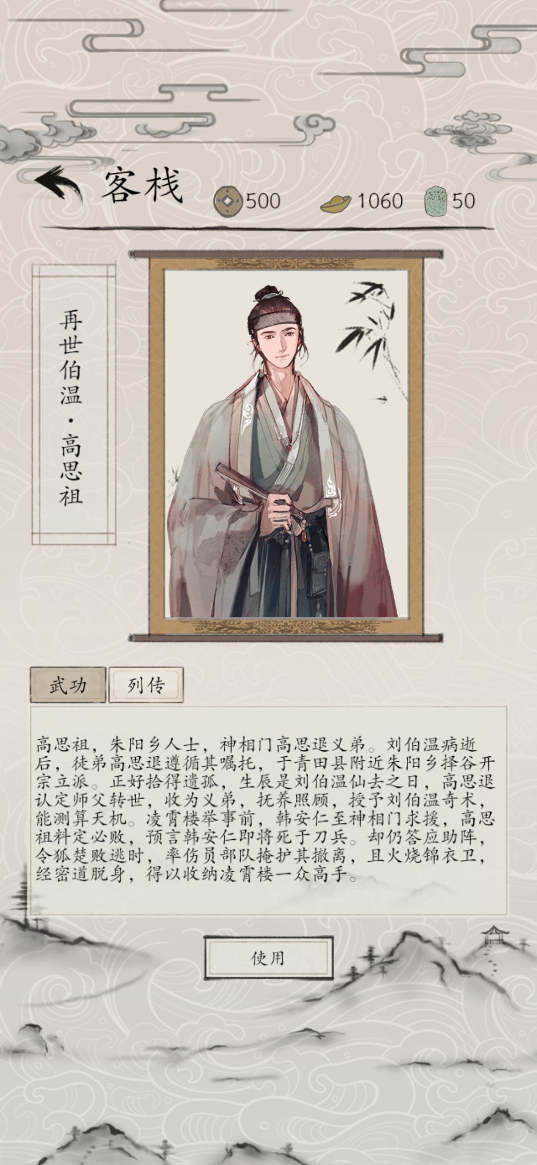 高思祖,神相门掌座高思退之弟,凭借出色智谋辅佐兄长,将神相门发展为江湖大宗。原著中因为其生辰八字,与高思退的恩师刘伯温的逝世之期巧合,故被认为是刘基转世。其武功技能为:“洞若观火”,技能效果为:“施展本回合你的上张卡牌的招式效果”。高思祖的特点是能够复制任何卡牌的技能效果,如果你的卡组中拥有高策令卡牌,则复制稳赚。且能根据战局情况,选择复制伤害效果或治疗效果,甚至buff效果和特殊机制效果,搭配千变万化,十分灵活。