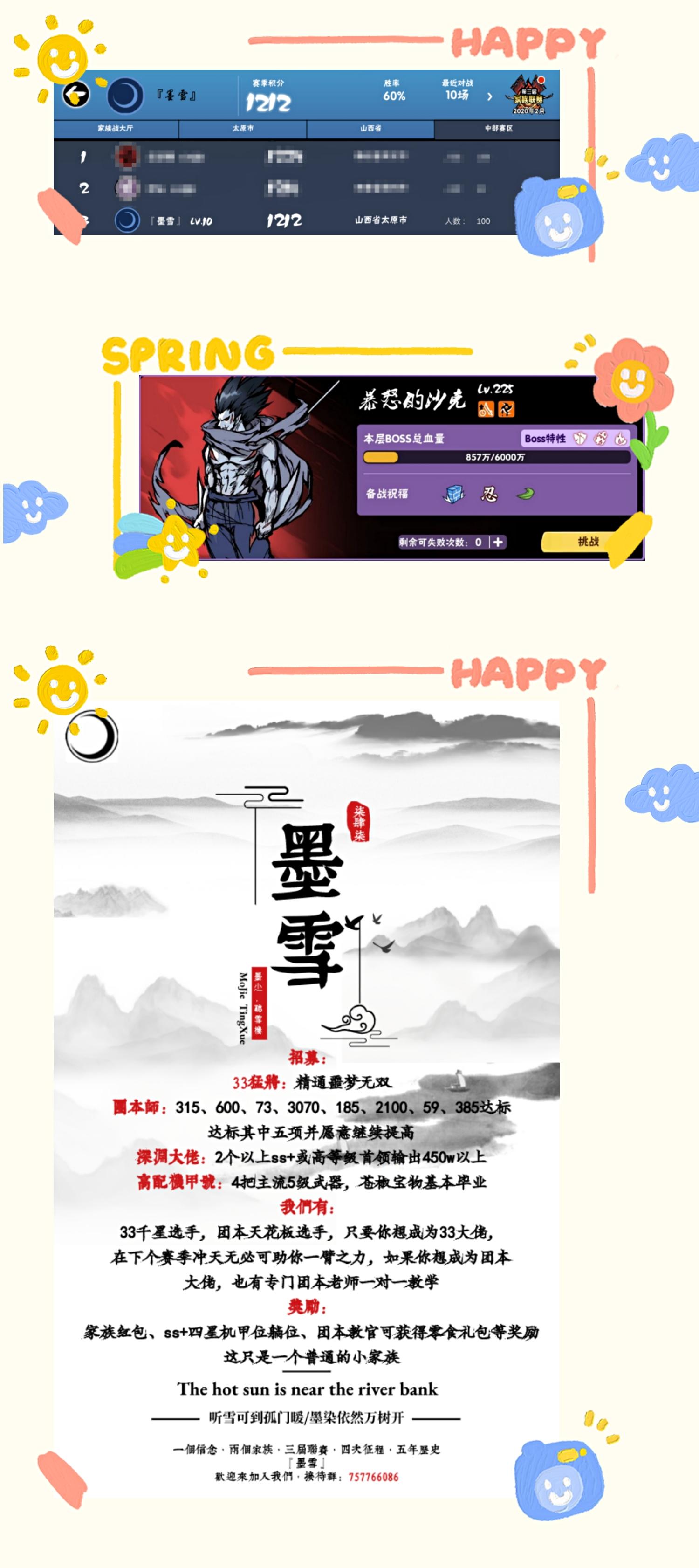 稳定中前四,常年打八级战场,只要想上场,都会安排,管理稳定,家族氛围和谐,机甲除家族战机甲外无任何要求,团本师,副将主将各司其职,虽然经常打八级战场但是压力较小,无口嗨选手。还有不定时红包福利。
