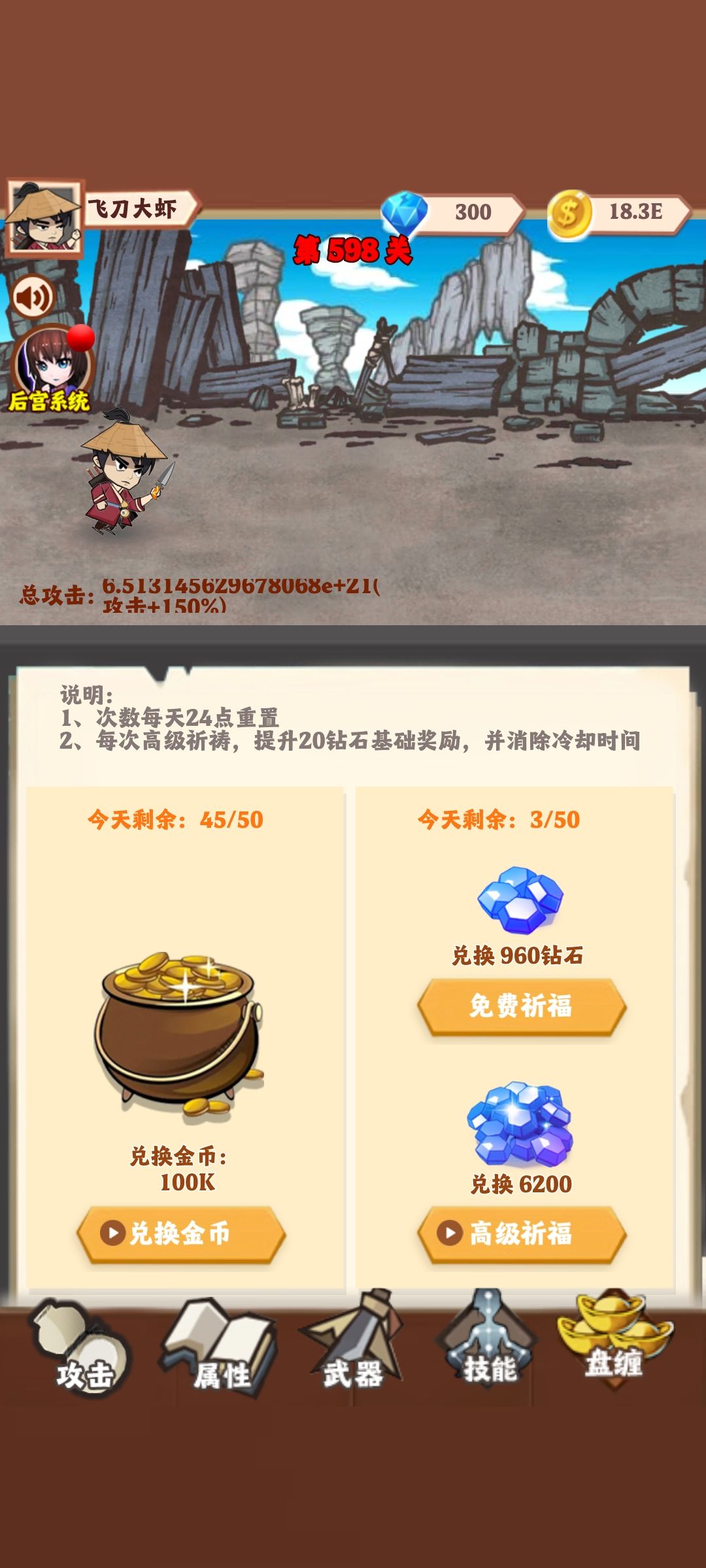 最后:最高关598关、转生后加成百分比一开始就有