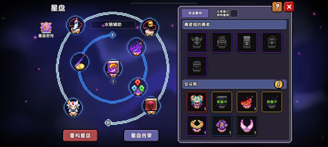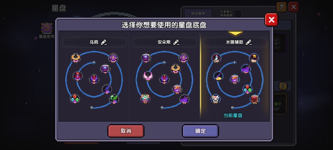 不同的职业更换,以及功能的更换涉及到星盘更换时,我们也可以灵活运用星盘方案来操作。目前常用的是安朵斯月 乌鸦木水火 辅助。