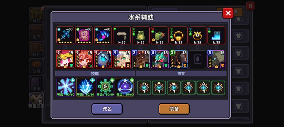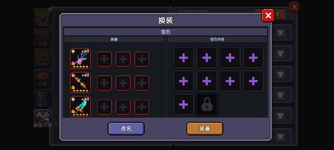 活用我的方案,将一套完整的bd,保存在方案中。同时点击笔继续改名,为了自己更好的寻找,点击衣服可以选择穿戴,也可以选择点击那一行,看详情。50砖石购买一页很便宜,建议购买。