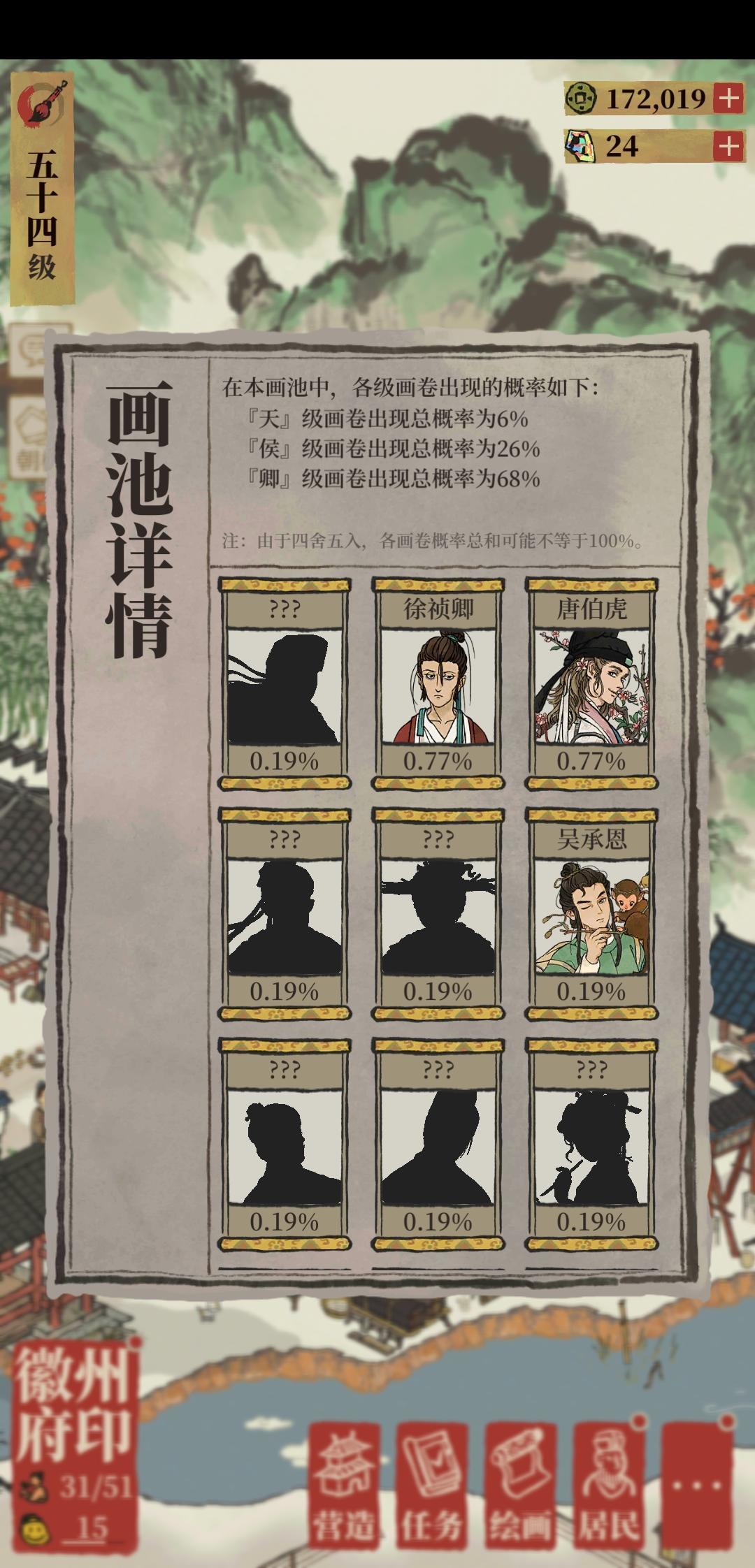 1、人物池用金画轴/友情画轴,池里既有人物也有珍宝。金画轴池里有天/侯/卿级人物和天级珍宝,每个月有新人物;友情画轴池里有卿/士级人物,和破烂珍宝。