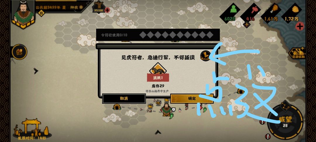 细节如下:1.刑天每场战斗技能必用,不然好感满不了。 2.3499年打完必须挂机掐表到3496,多一年都可能有些英雄刷不出来等半天(除开开图大概要离线挂机14-18分钟,这个时间不能超过也不能少,7分钟一年自己算) 3.期间比干技能不能停,不然伊伊好感满不了。 4.再强调一次,可以不点建筑,不祭祀,但比干和刑天技能必须用,不然满不了。 5.很多人不会用加速行军(哎呀我打不了这么快,开图都得好几年),这里说明一下,如图: