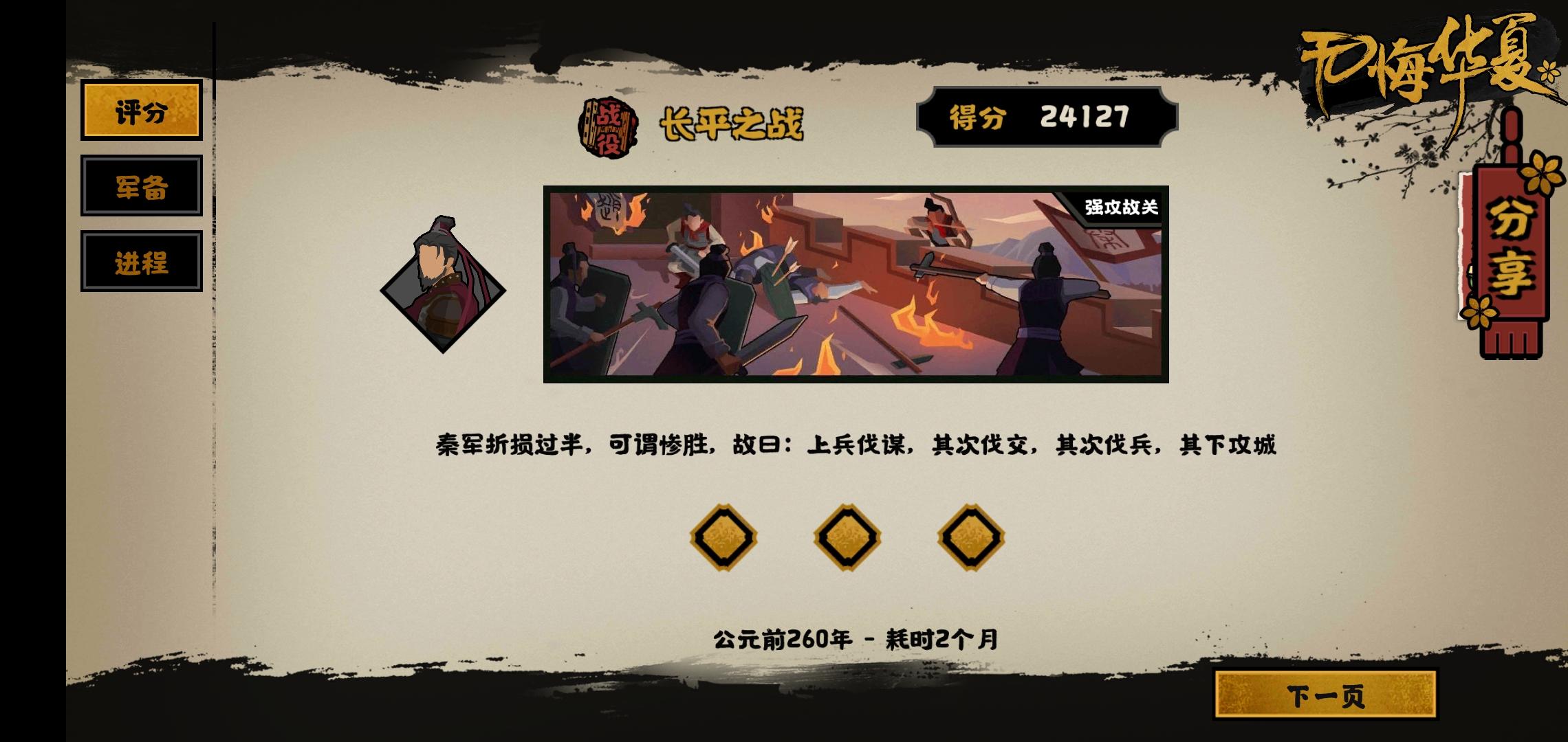 探索建议尽量不要点 实在差一两个粮草可以点一下 除了隐士必须去走 路上有打架的都尽量少走 打到泫氏城的时候六万打十万六级步兵我试了不管怎么拉扯都打不过 不知道大家有没有好的方法 打输了以后走围歼路线 后面都挺好打的 打到故关完成速取任务以后可以一直探索 每满三次会有五万兵来打 六级步兵加隐士给的buff还是很容易的 只要打赢了决战就减50000兵和15士气 我每次都打到决战只有两三万兵 然后后面就随便打了