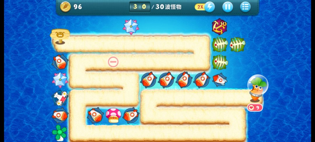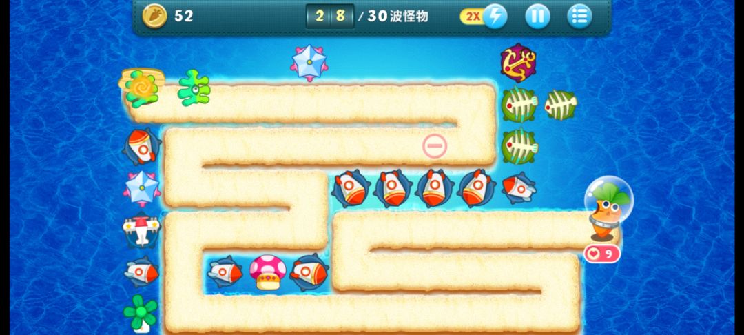 原来的障碍物清除以后 哪些太阳什么的没什么用可以买了,因为深海怪多速度又快,最好是每个角落都能有控速的,然后加群攻技能的一片片清怪就行。
