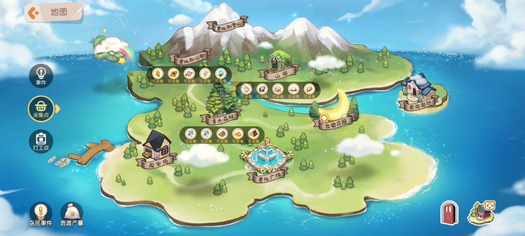 3.❗️去奥比斯山脚采花❗️,具体操作:点击右边地图,点击奥比斯山脚。新熊看到亮点采集不了,可以先找到风儿,点击扎花,随便点击一朵花,再点击采集即可自动前往。(如图3)